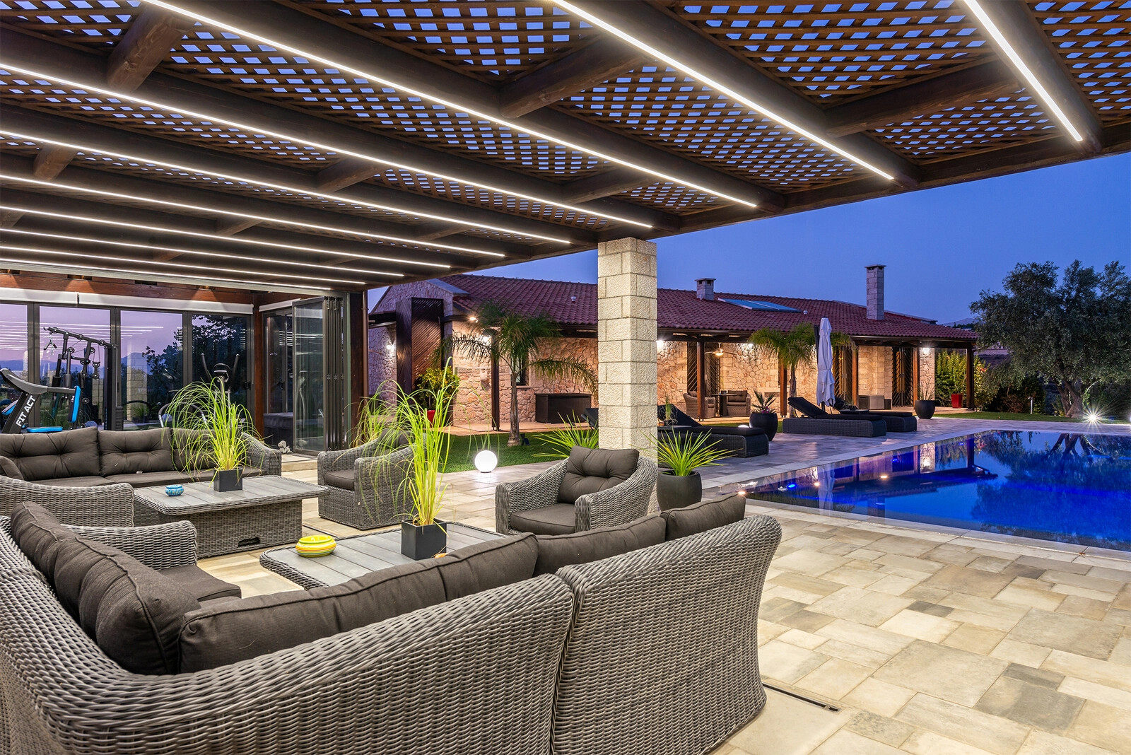 Bedrooms & Amenities: The four bedrooms are havens of tranquility, featuring wooden floors and stone accents. The master suite, with its private bathroom and pool access, promises luxurious seclusion. Five modern shower bathrooms with ceramic tiles meet every need. A gym, jacuzzi, and a state-of-the-art water filtration system elevate the experience, while the Fan Coil cooling-heating system ensures year-round comfort.