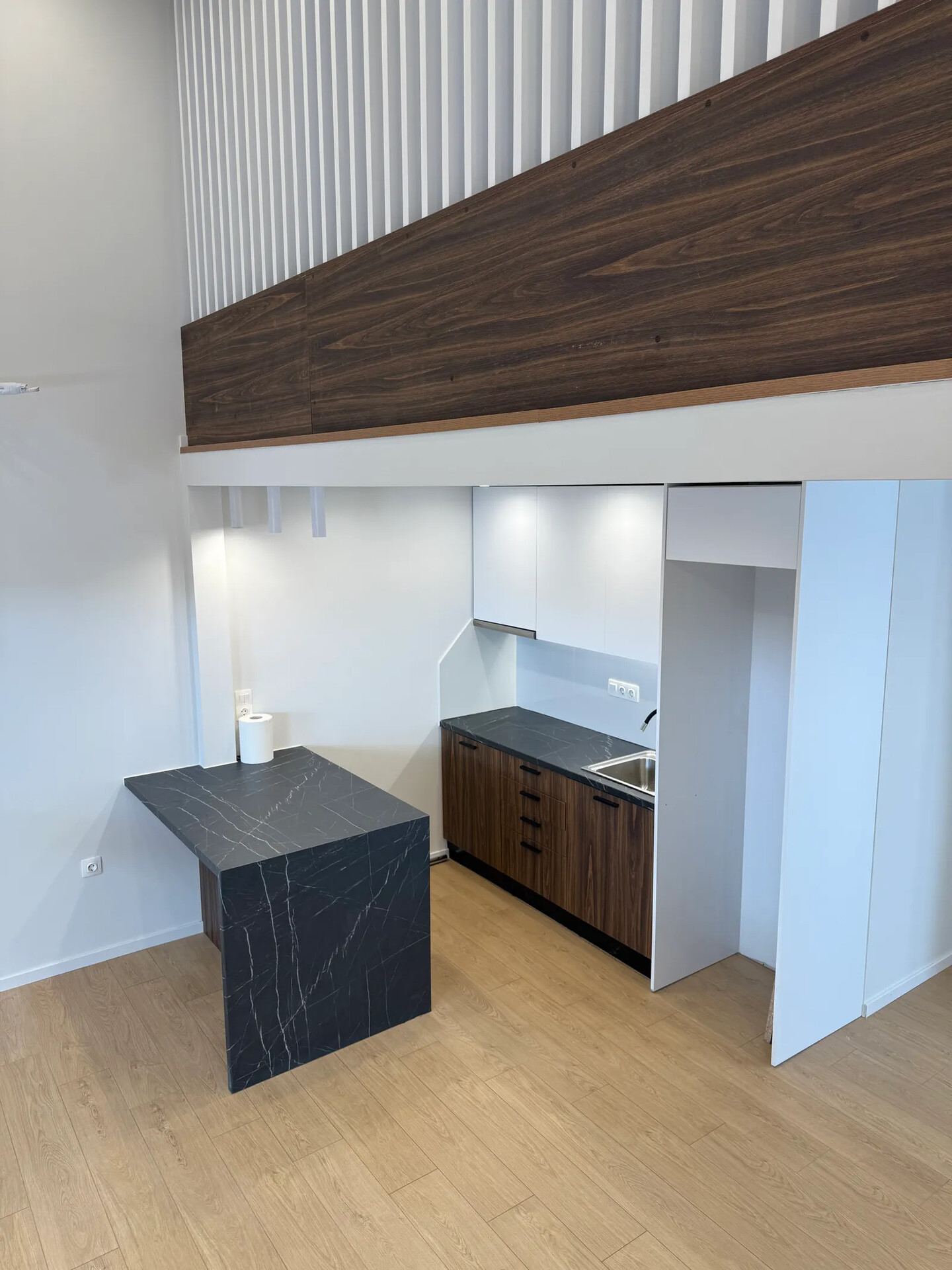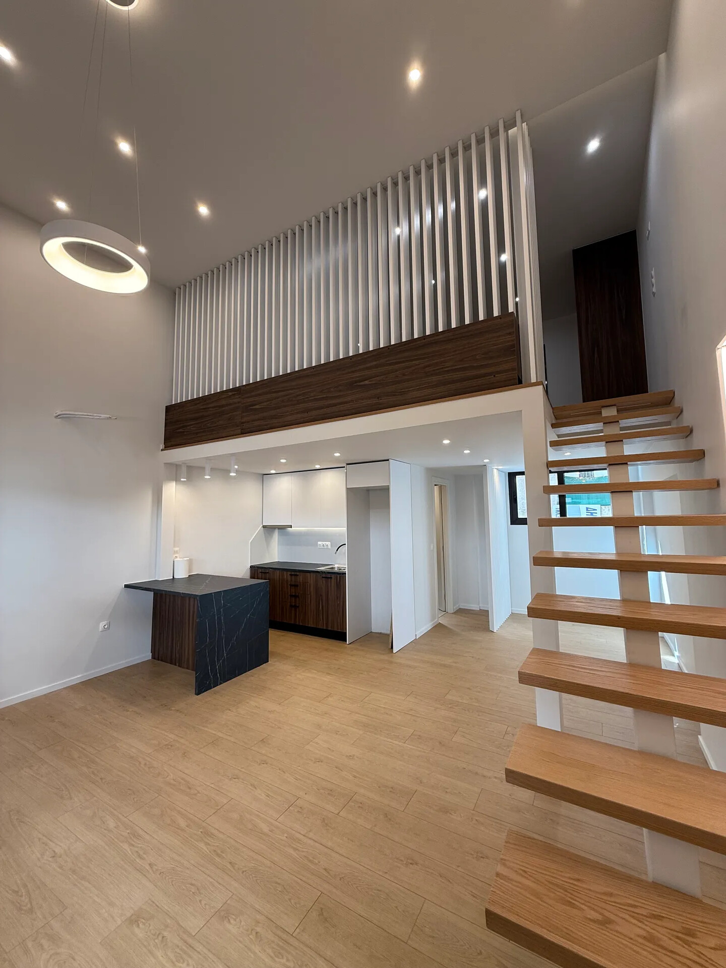 Completely renovated in 2025, the apartment features impressive ceiling height, warm wooden flooring, designer lighting, and a modern floating staircase leading to the loft.