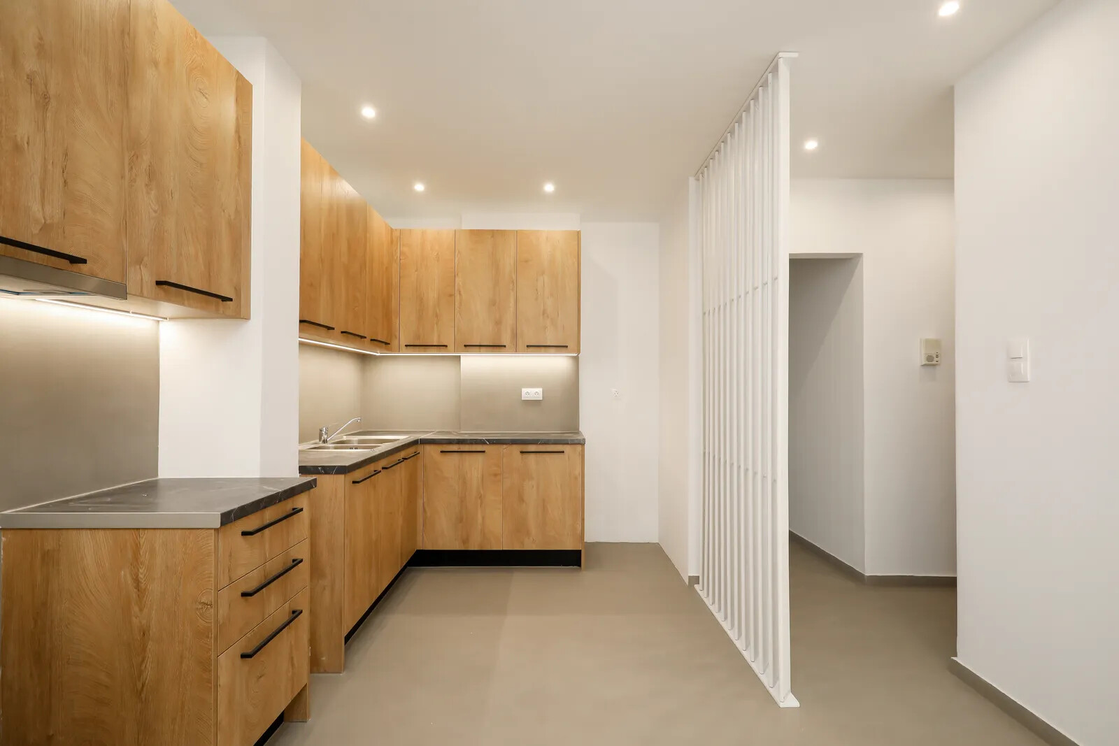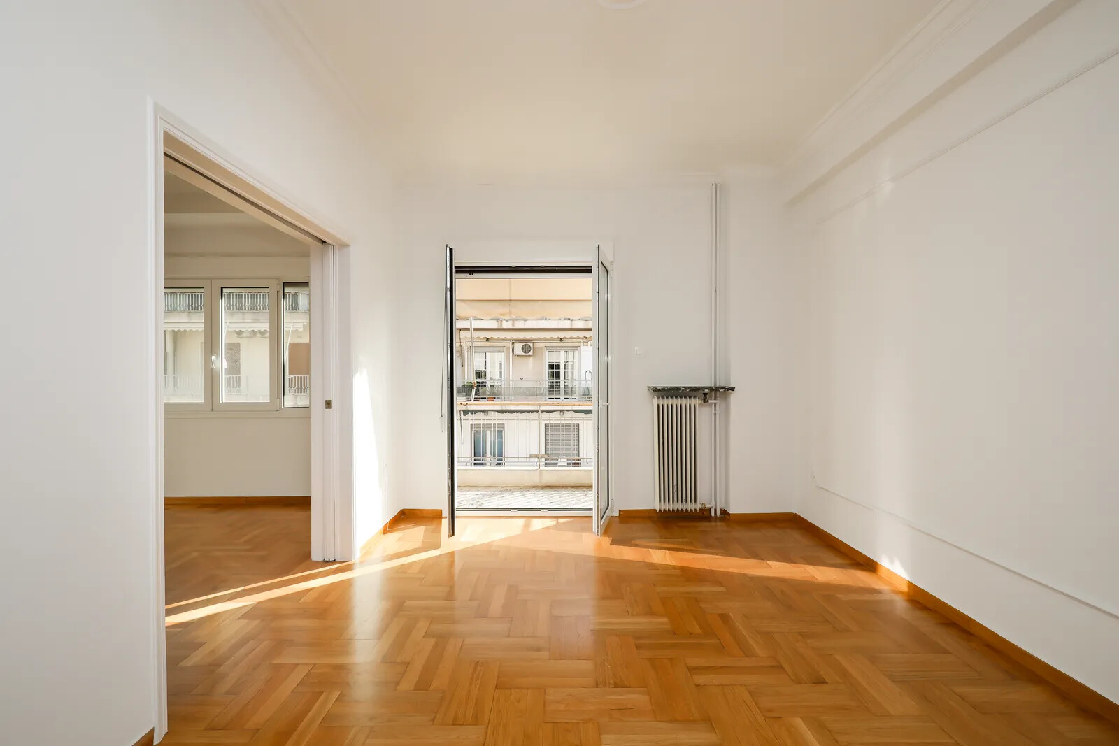A 110 sq.m. apartment is offered for sale in Kypseli, Athens, located on the 4th floor of a residential building constructed in 1963. The property has been fully and comprehensively renovated in 2026, including new flooring, plumbing and electrical installations, aluminum window frames, and complete bathroom renovation.