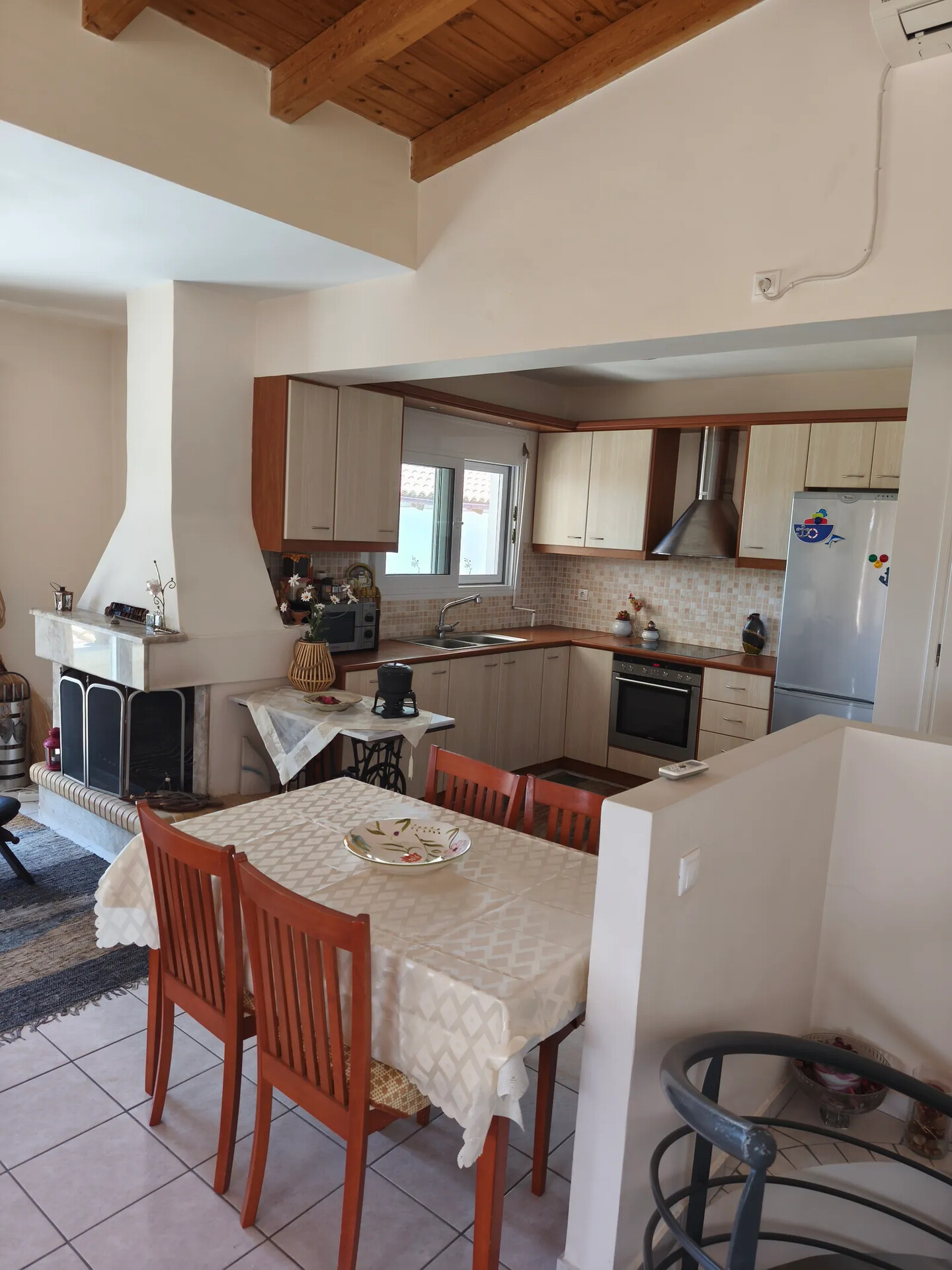 Bright living room with fireplace, dining area, and functional kitchen. A guest WC is also available. Surrounding verandas provide panoramic views and direct access to the garden.